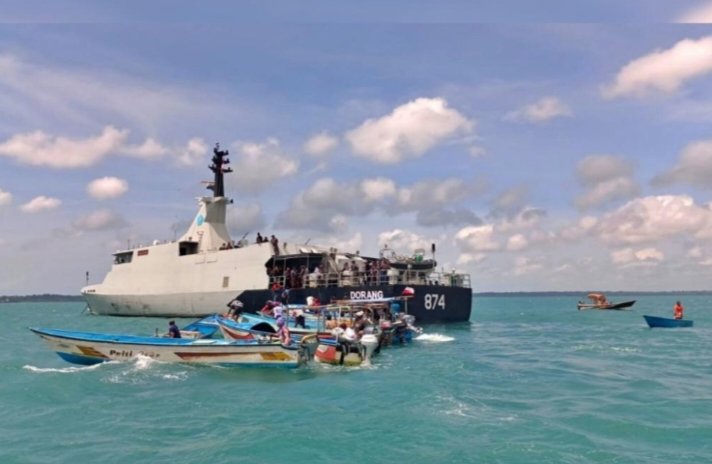 JAKARTA – TNI AL mendistribusikan bantuan paket sembako kepada puluhan nelayan yang mendekati KRI Dorang-874 saat melaksanakan lego jangkar di perairan belakang Pulau Wamar, Kepulauan Aru, Rabu (4/3/2026).